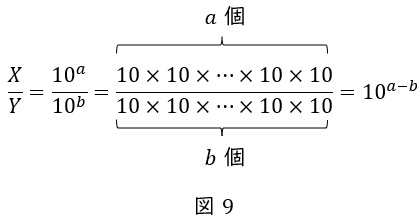 (2) わり算は引き算に \( \ \displaystyle \log_{10}\frac {X}{Y}=\log_{10}X-\log_{10}Y \ \)