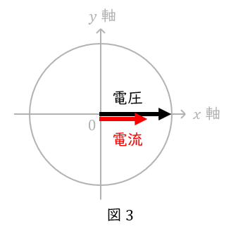 以上より,抵抗だけの回路のベクトル図は図\( \ 3 \ \)となります。
