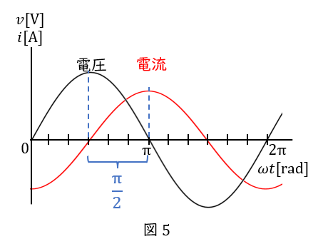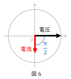 コイルでは,電流が電圧に対して\( \ \displaystyle \frac{\pi}{2} \ \)だけ遅れます(図\( \ 5 \ \))。
