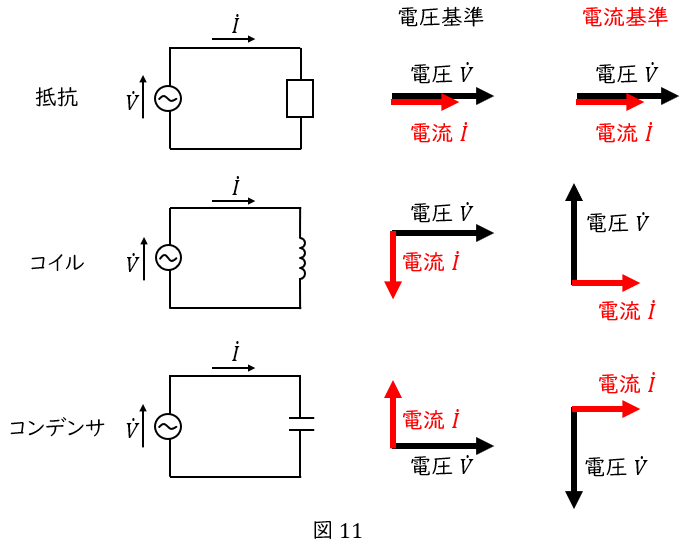 したがって,図\( \ 11 \ \)でいえば,電圧ベクトルと電流ベクトルの相対的な向きだけが大切なのです。