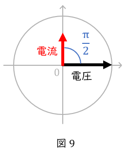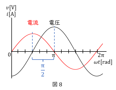 コンデンサでは,電圧が電流に対して\( \ \displaystyle \frac{\pi}{2} \ \)だけ遅れます(図\( \ 8 \ \))。