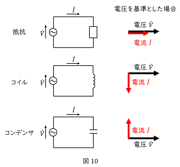 電圧と電流の関係をベクトル図にすると,図\( \ 10 \ \)になります。
