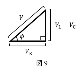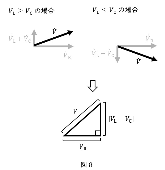 絶対値の記号を使えば,どちらの場合であっても\( \ |V_{\mathrm {L}}-V_{\mathrm {C}}| \ \)と書くことができます(図\( \ 8 \ \))。