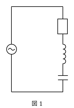 抵抗値\( \ R \ \)の抵抗,インダクタンス\( \ L \ \)のコイル,静電容量\( \ C \ \)のコンデンサが,角周波数\( \ \omega \ \)の交流電源に直列に接続された回路について,インピーダンスを導出します(図\( \ 1 \ \))。