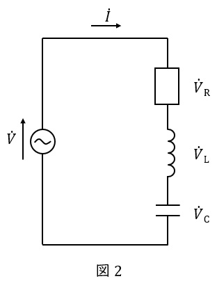 電流を\( \ \dot{I} \ \)とします。直列回路ですから,抵抗にもコイルにもコンデンサ同じ電流が流れます(図\( \ 2 \ \))。