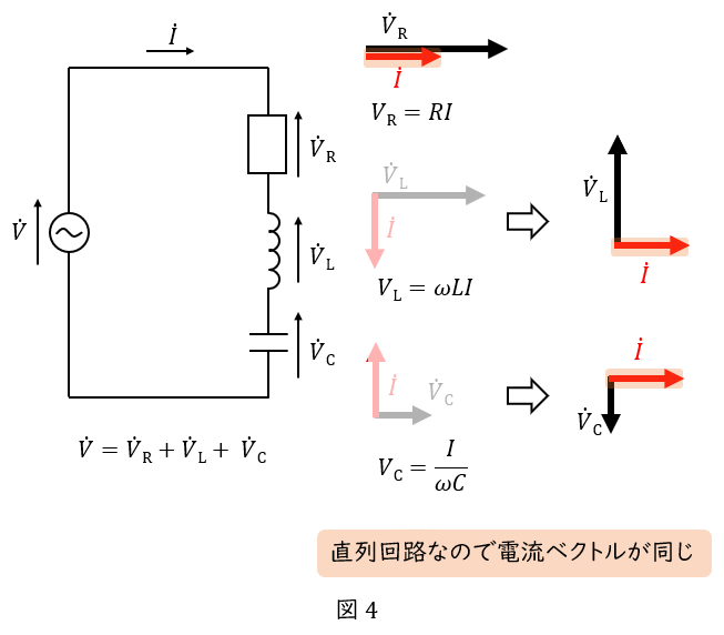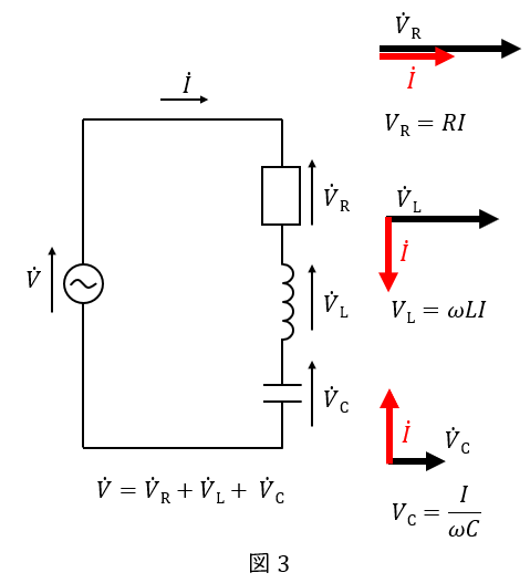 \( \ \dot{V} = \dot{V_{\mathrm {R}}} + \dot{V_{\mathrm {L}}} + \dot{V_{\mathrm {C}}} \ \)ですから,