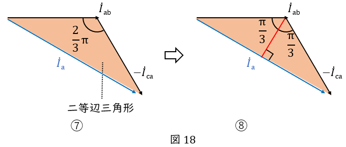 \( \ \dot{I_{\mathrm {ab}}} \ \)と\( \ -\dot{I_{\mathrm {ca}}} \ \)が同じ大きさですから,二等辺三角形です。
