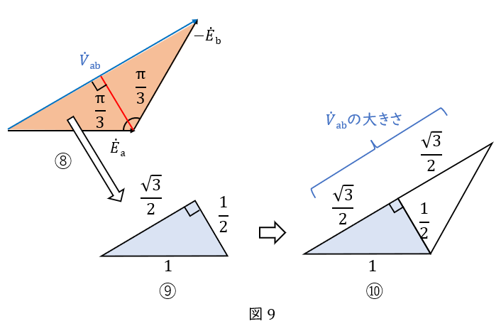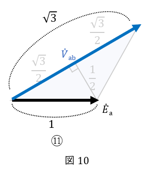 ⑩つまり,\( \ \dot{E_{\mathrm {a}}} \ \)の大きさを\( \ 1 \ \)とすると,\( \ \dot{V_\mathrm {ab}} \ \)の大きさは,\( \ \displaystyle \frac{\sqrt{3}}{2} \ \)が\( \ 2 \ \)つ分,つまり\( \ \sqrt{3} \ \)です(図\( \ 9 \ \))。