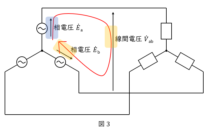 赤の閉ループは,相電圧\( \ \dot{E_{\mathrm {a}}} \ \)と\( \ \dot{E_{\mathrm {b}}} \ \),線間電圧\( \ \dot{V_{\mathrm {ab}}} \ \)が含まれています。