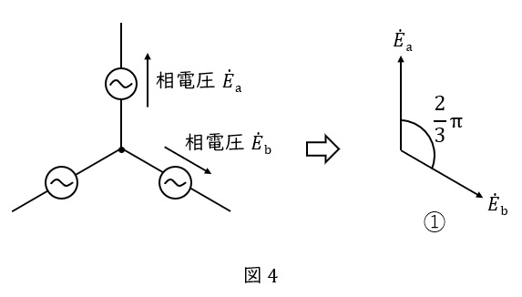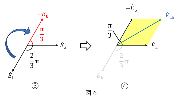 \( \ \dot{E_{\mathrm {a}}} \ \)と\( \ -\dot{E_{\mathrm {b}}} \ \)のなす角は\( \ \displaystyle \frac{\pi}{3} \ \)となります。