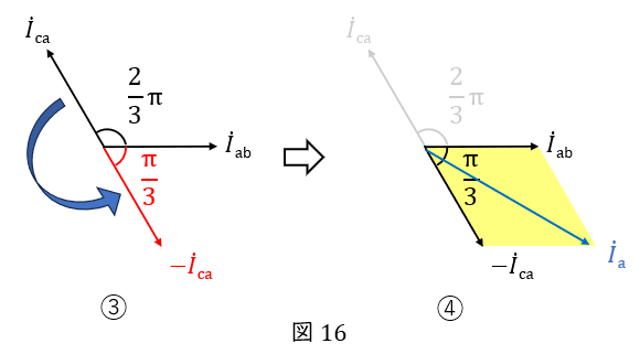 平行四辺形の対角線でしたね(図\( \ 16 \ \)の④)。これが,線電流\( \ \dot{I_{\mathrm {a}}} \ \)となります。