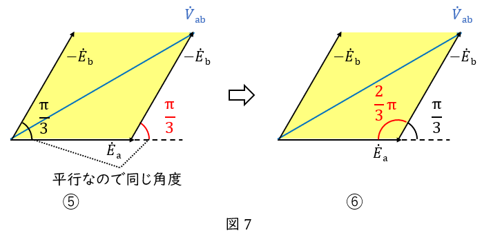 平行四辺形の対角線でしたね(図\( \ 6 \ \)の④)。これが,線間電圧\( \ \dot{V_{\mathrm {ab}}} \ \)となります。