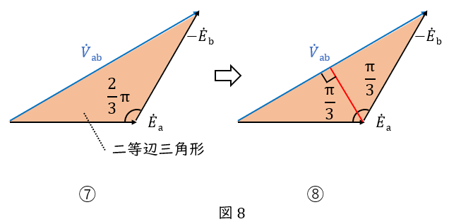 \( \ \dot{E_{\mathrm {a}}} \ \)と\( \ -\dot{E_{\mathrm {b}}} \ \)が同じ大きさですから,二等辺三角形です。