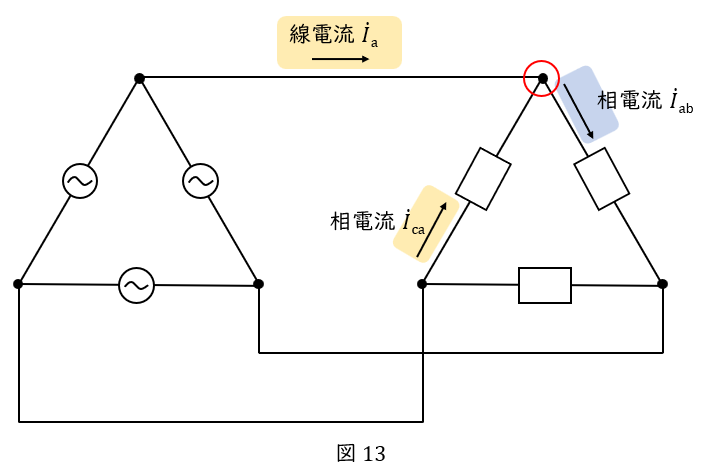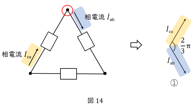 図\( \ 13 \ \)の赤丸部分に注目すると,線電流\( \ \dot{I_{\mathrm {a}}} \ \)と相電流\( \ \dot{I_{\mathrm {ca}}} \ \)が流れ込み,相電流\( \ \dot{I_{\mathrm {ab}}} \ \)が出ていきます。