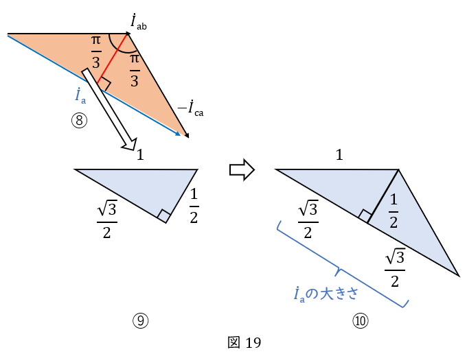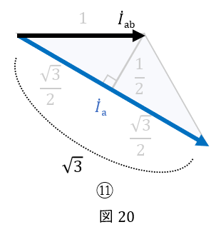 ⑩つまり,\( \ \dot{I_{\mathrm {ab}}} \ \)の大きさを\( \ 1 \ \)とすると,\( \ \dot{I_\mathrm {a}} \ \)の大きさは,\( \ \displaystyle \frac{\sqrt{3}}{2} \ \)が\( \ 2 \ \)つ分,つまり\( \ \sqrt{3} \ \)です(図\( \ 19 \ \))。