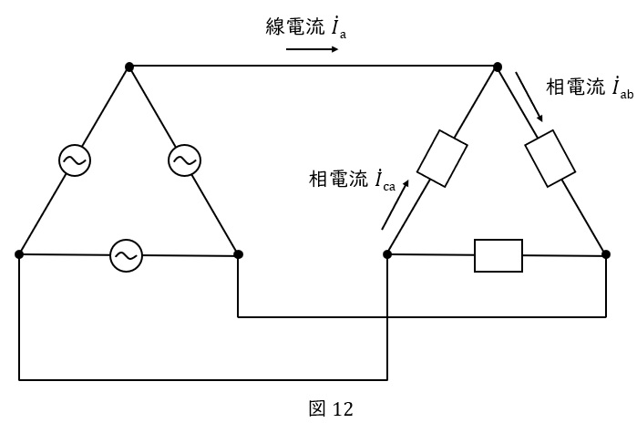 図\( \ 12 \ \)の電流のことを,線電流\( \ \dot{I_{\mathrm {a}}} \ \),相電流\( \ \dot{I_{\mathrm {ab}}} \ \),\( \ \dot{I_{\mathrm {ca}}} \ \)といいます。