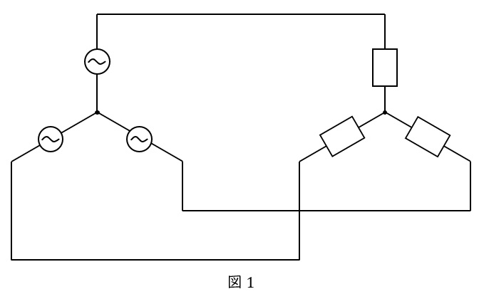 \( \ \mathrm {Y-Y} \ \)結線とは,図\( \ 1 \ \)のように電源も負荷も\( \ \mathrm {Y} \ \)結線の回路です。