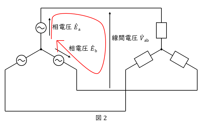 たとえば赤の閉ループに注目すると,相電圧\( \ \dot{E_{\mathrm {a}}} \ \)と\( \ \dot{E_{\mathrm {b}}} \ \),線間電圧\( \ \dot{V_{\mathrm {ab}}} \ \)が含まれることが分かります(図\( \ 2 \ \))。