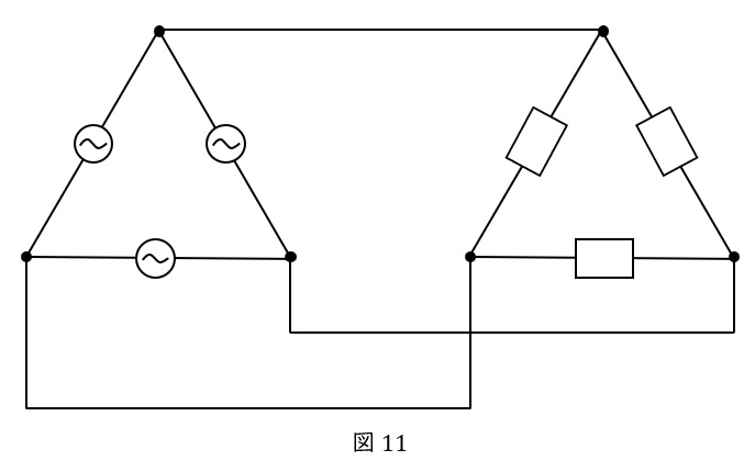 \( \ \mathrm {\Delta-\Delta} \ \)結線とは,図\( \ 11 \ \)のように電源も負荷も\( \ \mathrm {\Delta} \ \)結線の回路です。