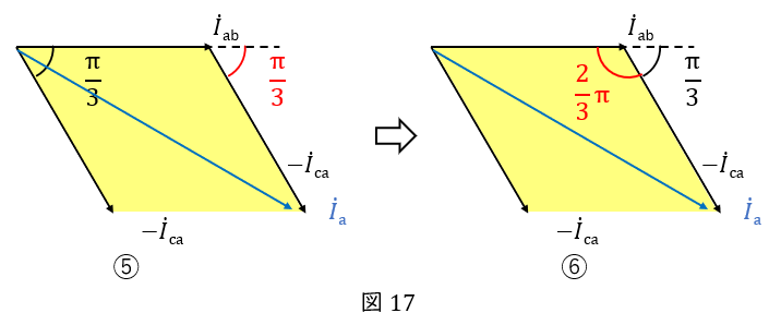 ④\( \ \dot{I_{\mathrm {ab}}} \ \)と\( \ -\dot{I_{\mathrm {ca}}} \ \)のなす角は\( \ \displaystyle \frac{\pi}{3} \ \)となります。