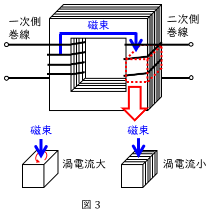 図3に示すように,成層構造(層状に重なっている構造)にすることで渦電流損を低減することができます。