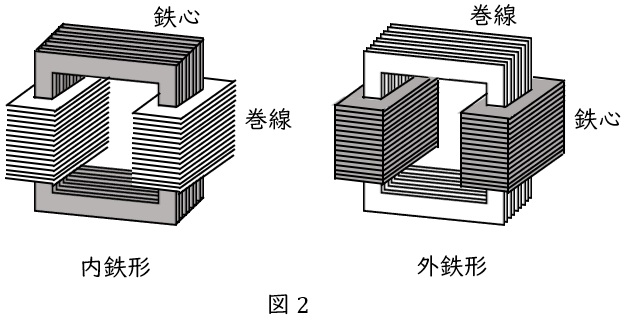 下図に示すように内側に鉄心があるものを内鉄形,外側に鉄心があるものを外鉄形といいます。