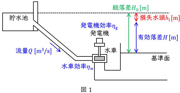 \] で求められます。これは重力加速度\( \ g=9.8 \ \mathrm {[m/s^{2}]} \ \)及び水の密度\( \ \rho =1 \ 000 \ \mathrm {[kg/m^{3}]} \ \)を使用した時の発電機の出力である