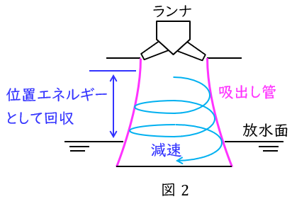 ランナで仕事をした水をそのまま放水口に出すのではなく,ランナから出た水の流路を広げランナ出口の圧力を大気圧以下に保持し,ラッパ状に広げ流速を落とすことで運動エネルギーを位置エネルギーとして回収します。