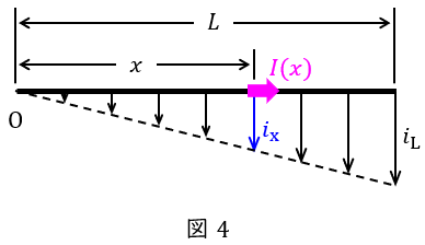 末端での電流密度を\( \ i_{L} \ \mathrm {[A]} \ \)とすると,送電端から\( \ x \ \mathrm {[m]} \ \)の地点における電流密度\( \ i_{x} \ \mathrm {[A]} \ \)は,