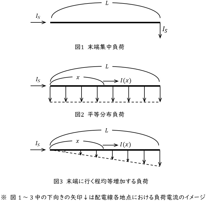 となるので,\( \ x \ \mathrm {[m]} \ \)における配電線路の電流\( \ I(x) \ \mathrm {[A]} \ \)は,\( \ x \ \mathrm {[m]} \ \)から\( \ L \ \mathrm {[m]} \ \)までの電流密度の合計であるから,