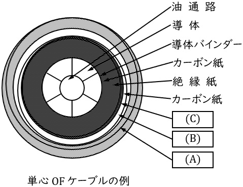 図は\( \ \mathrm {OF} \ \),\( \ \mathrm {CV} \ \)の単心ケーブルで超高圧用の代表的な断面を示しており,中心の導体の周囲に絶縁体を配置している。この他,図中で外周にある\( \ \mathrm {A} \ \)は\( \ \fbox { (1) } \ \)で,電食と化学腐食等の対策の役目をしている。\( \ \mathrm {B} \ \)は\( \ \fbox { (2) } \ \)であり,絶縁体の保護,内部の絶縁油の密封のほか絶縁油の圧力に耐えたり,湿気が絶縁体に侵入するのを防止する機能や,故障電流の帰路などの機能を持たせている。\( \ \mathrm {B} \ \)の材料としては,\( \ \fbox { (3) } \ \),\( \ \fbox { (4) } \ \),ステンレスなどを使っているが,\( \ \fbox { (3) } \ \)は化学的に安定しているものの機械的強度に劣ることから,近年は,機械的強度や経済性を考慮して\( \ \fbox { (4) } \ \)の採用が増えている。