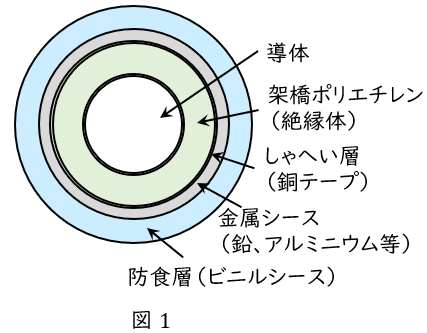 ワンポイント解説「1.\( \ \mathrm {CV} \ \)ケーブルの特徴」の通り,金属シースには鉛,アルミニウムが使われますが,近年機械的強度や経済性を考慮して使用されているのはアルミニウムとなります。