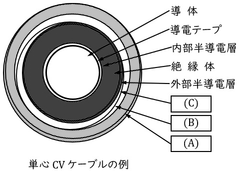 ワンポイント解説「1.\( \ \mathrm {CV} \ \)ケーブルの特徴」の通り,絶縁体の外側の\( \ \mathrm {C} \ \)は,電気的特性の安定性向上のためのしゃへい層となります。