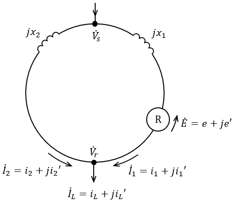 これを用いた潮流調整の原理を図の系統を例にして考える。図のループ系統において,負荷電流\( \ {\dot I}_{L} \ \)が\( \ {\dot I}_{1} \ \)と\( \ {\dot I}_{2} \ \)に分流し,ループの両端には\( \ {\dot V}_{s}-{\dot V}_{r} \ \)の電圧差(線間電圧)が生じている。ここで図中\( \ \mathrm {R} \ \)が\( \ \fbox {  (3)  } \ \)であり,その両端に発生する電圧\( \ \dot E \ \)を変化させるとき,