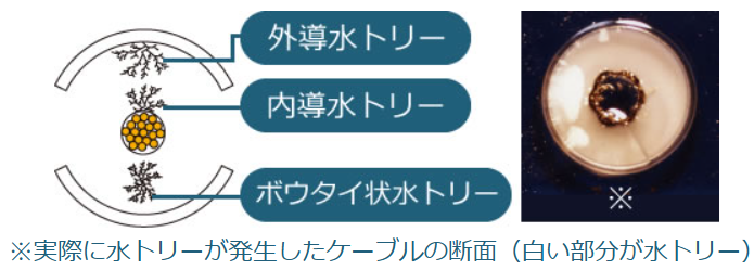 ⑥水分が含まれると水トリーと呼ばれる樹枝状に絶縁劣化する現象が発生する。