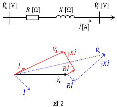 図2のように,通常時であれば,負荷はほぼ遅れ力率であるため,電流は電圧より位相が遅れ,青線のようなベクトル図となります。しかし,電流が進み電流になると,ベクトル図が赤線のような形となり,送電端電圧\( \ {\dot V}_{\mathrm {s}} \ \)が受電端電圧\( \ {\dot V}_{\mathrm {r}} \ \)よりも小さくなる現象が発生することがあります。