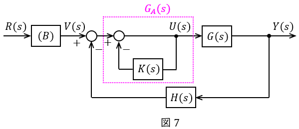 図1のブロック線図を等価変換すると図6のようになり,これを図2と比較すると\( \ G_{A}(s) \ \)は図7に示す箇所となる。