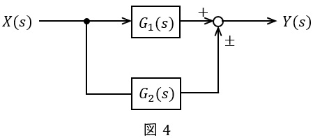 図4のような伝達関数\( \ G_{1}(s) \ \),\( \ G_{2}(s) \ \)が与えられているとき,全体の伝達関数\( \ G(s) \ \)は,
