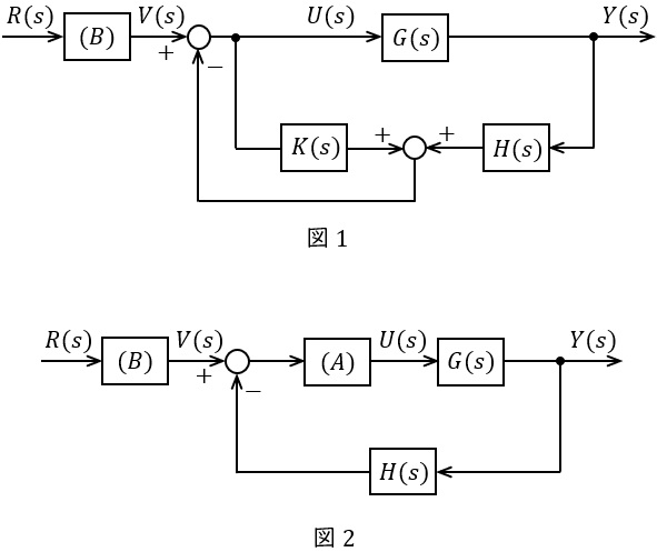 (1) 図1のブロック線図を図2のように描き変えたとき,ブロック\( \ \mathrm {(A)} \ \)の伝達関数\( \ G_{A}(s) \ \)を求めよ。