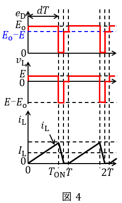 \] となる。したがって,電流断続動作モードの場合の\( \ e_{\mathrm {D}} \ \)と\( \ v_{\mathrm {L}} \ \)の概形は図4のようになる。