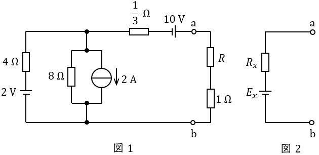 図1の回路の端子\( \ \mathrm {a-b} \ \)より左側の部分を図2に示す単一の抵抗\( \ R_{x} \ \)と単一の電圧源\( \ E_{x} \ \)からなる等価回路に変換する。このとき,\( \ R_{x}= \ \fbox { (1) } \ \mathrm {[\Omega ]} \ \),\( \ E_{x}= \ \fbox { (2) } \ \mathrm {[V]} \ \)となる。