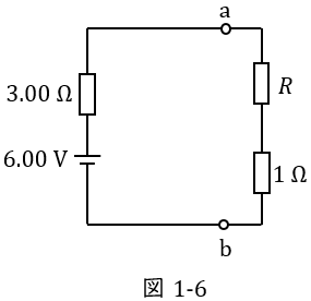次に,抵抗\( \ R \ \)と\( \ 1 \ \mathrm {[\Omega ]} \ \)の抵抗の直列回路を図2の端子\( \ \mathrm {a-b} \ \)間に接続した場合を考えれば,抵抗\( \ R \ \)で消費される電力\( \ P \ \)は\( \ \fbox { (3) } \ \mathrm {[W]} \ \)となり,これより\( \ P \ \)の最大値は\( \ \fbox { (4) } \ \mathrm {[W]} \ \),また,このときの\( \ R \ \)は\( \ \fbox { (5) } \ \mathrm {[\Omega ]} \ \)となる。