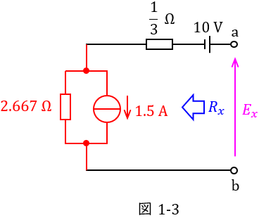 さらに,ワンポイント解説「2.電圧源と電流源の等価変換」の通り,図1-3の\( \ 1.5 \ \mathrm {[A]} \ \)の電流源と\( \ 2.667 \ \mathrm {\Omega } \ \)の抵抗を等価変換すると図1-4の通りとなる。ただし,電圧源の大きさは,\( \ \displaystyle 2.667\times 1.5≒4.00 \ \mathrm {[V]} \ \)である。