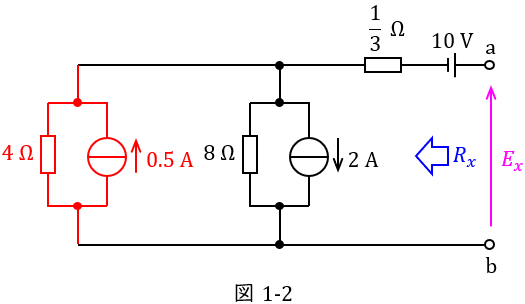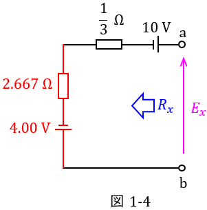 ワンポイント解説「1.テブナンの定理」の通り,求める図2の\( \ R_{x} \ \)と\( \ E_{x} \ \)は図1-1に示す値である。