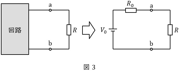 図3のように複雑な回路を電圧源\( \ V_{0} \ \mathrm {[V]} \ \)と抵抗\( \ R_{0} \ \mathrm {[\Omega ]} \ \)に置き換える方法です。