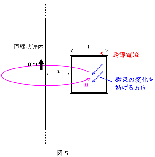 図5に示すように,直線状導体による磁界\( \ H \ \)は右ねじの法則から図5のようになり,その磁束の変化を妨げる方向に誘導電流が流れるため,誘導電流の流れる向きは左回りの向きとなる。