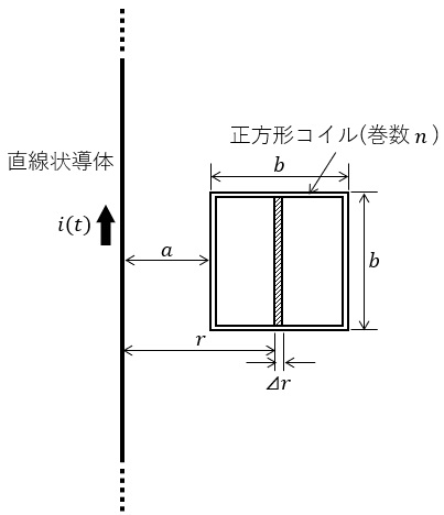 図のように,透磁率\( \ \mu _{0} \ \)の空間の同一平面上に,一辺の長さ\( \ b \ \),巻数\( \ n \ \)の正方形コイルと無限に長い直線状導体とが置かれている。正方形コイルの導体及び直線状導体の太さは無視でき,正方形コイルの一辺は直線状導体に平行で,距離\( \ a \ \)だけ離れている。時刻\( \ t=0 \ \)において直線状導体及び正方形コイルには電流は流れていない。
