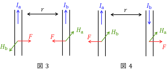 図3のような同方向に電流が流れている場合を考えます。電流\( \ I_{\mathrm {b}} \ \mathrm {[A]} \ \)により発生する電流\( \ I_{\mathrm {a}} \ \mathrm {[A]} \ \)が流れる導体部分の磁界の大きさ\( \ H_{\mathrm {b}} \ \mathrm {[A/m]} \ \)は,アンペールの法則より,