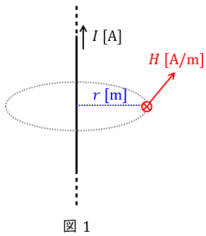 例えば,図1のように無限長直線電流\( \ I \ \mathrm {[A]} \ \)が流れているとき,電線から距離\( \ r \ \mathrm {[m]} \ \)の位置での磁界の強さ\( \ H \ \mathrm {[A / m]} \ \)は,\( \ l=2\pi r \ \)なので,