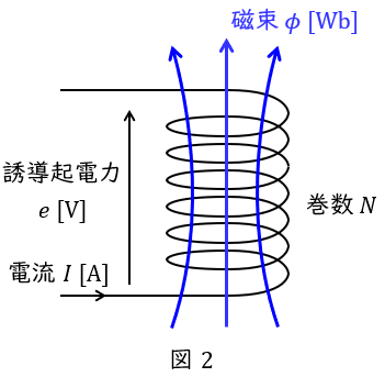 図2において,巻数\( \ N \ \)のコイルを貫通する磁束\( \ \phi \ \mathrm {[Wb]} \ \)があるとき,ファラデーの電磁誘導の法則より,コイルに発生する誘導起電力\( \ e \ \mathrm {[V]} \ \)は,磁束の時間変化に比例し,